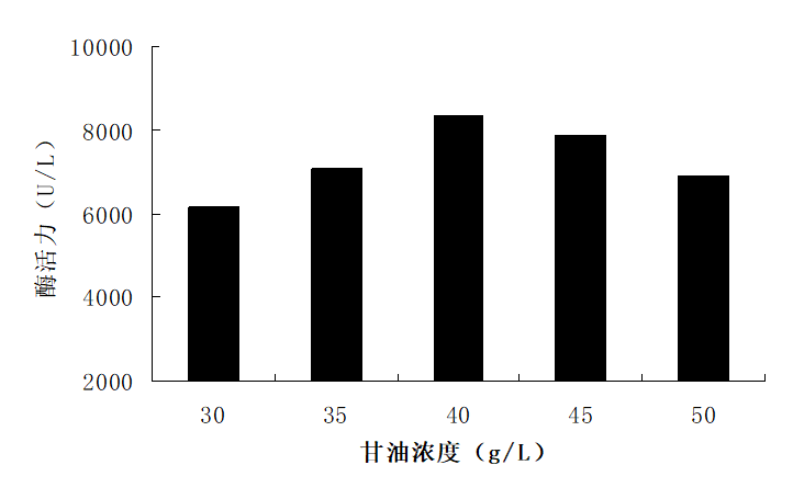 在其它发酵基础培养基成分不变的情况下,甘油按30、35、40、45、50 g/L比例加入,诱导培养96 h后,测PGA活力。从图1中能够准确的看出,当甘油质量浓度增高时,菌体产PGA表达水平也随之升高,但当甘油浓度大于40 g/L时,PGA表达水平却随甘油浓度升高而减少,而甘油浓度为40 g/L时重组毕赤酵母PGA表达水平最高,达到8 319 U/L。