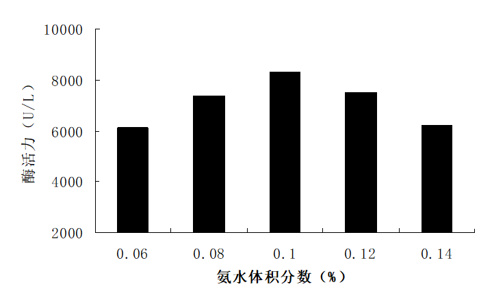 补料用的28%氨水预先经过滤除菌,氨水加入量按体积百分比计算分别为0.06%、0.08%、0.1%、0.12%、0.14%,每隔12 h补加1次。诱导培养96 h后,测PGA活力。从图2中能够准确的看出,随着氨水体积分数增高,PGA酶活也随之升高;当氨水体积分数等于0.1% 时,PGA酶活达到8 296 U/L;而当氨水体积分数大于0.1% 时,PGA酶活却随之下降,说明过高的氨水体积分数不利于毕赤酵母的PGA表达,所以本实验选取每12 h补加28%氨水至0.1%。