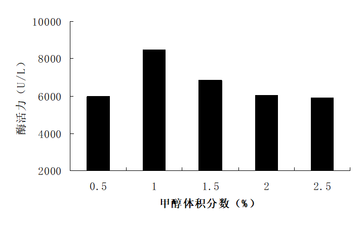 以甲醇浓度分别为0.5%、1%、1.5%、2%、2.5%的诱导培养基重悬菌体进行诱导培养,每24h补加甲醇维持以上浓度。诱导培养96 h后,测PGA活力。甲醇浓度过低,会限制菌体生长和诱导强度;浓度过高,则对菌体产生毒性。从图3中能够准确的看出,最适甲醇浓度为1.0%,PGA表达水平达到8 448 U/L;浓度超过1.5% 时,甲醇对菌体PGA表达水平有抑制作用。