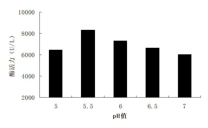 配制不同pH值为5.0、5.5、6.0、6.5、7.0的诱导培养基,诱导培养96 h后,测PGA活力。pH对菌体生长和诱导表达都会产生一定的影响,从图4中能够准确的看出,最适pH为1.0%,此时的PGA表达水平达到8 402 U/L。
