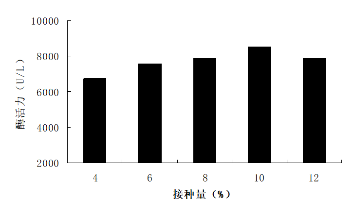 试验不同的接种量对毕赤酵母表达PGA的影响,接种量大小的控制对很多细胞培养和代谢物积累都起到及其重要的作用[9]。分别以4%、6%、8%、10%、12%的接种量接种到BSM基础盐生长培养基中,结果如图5所示,当接种量为10% 时,此时的PGA表达水平达到8 511 U/L。